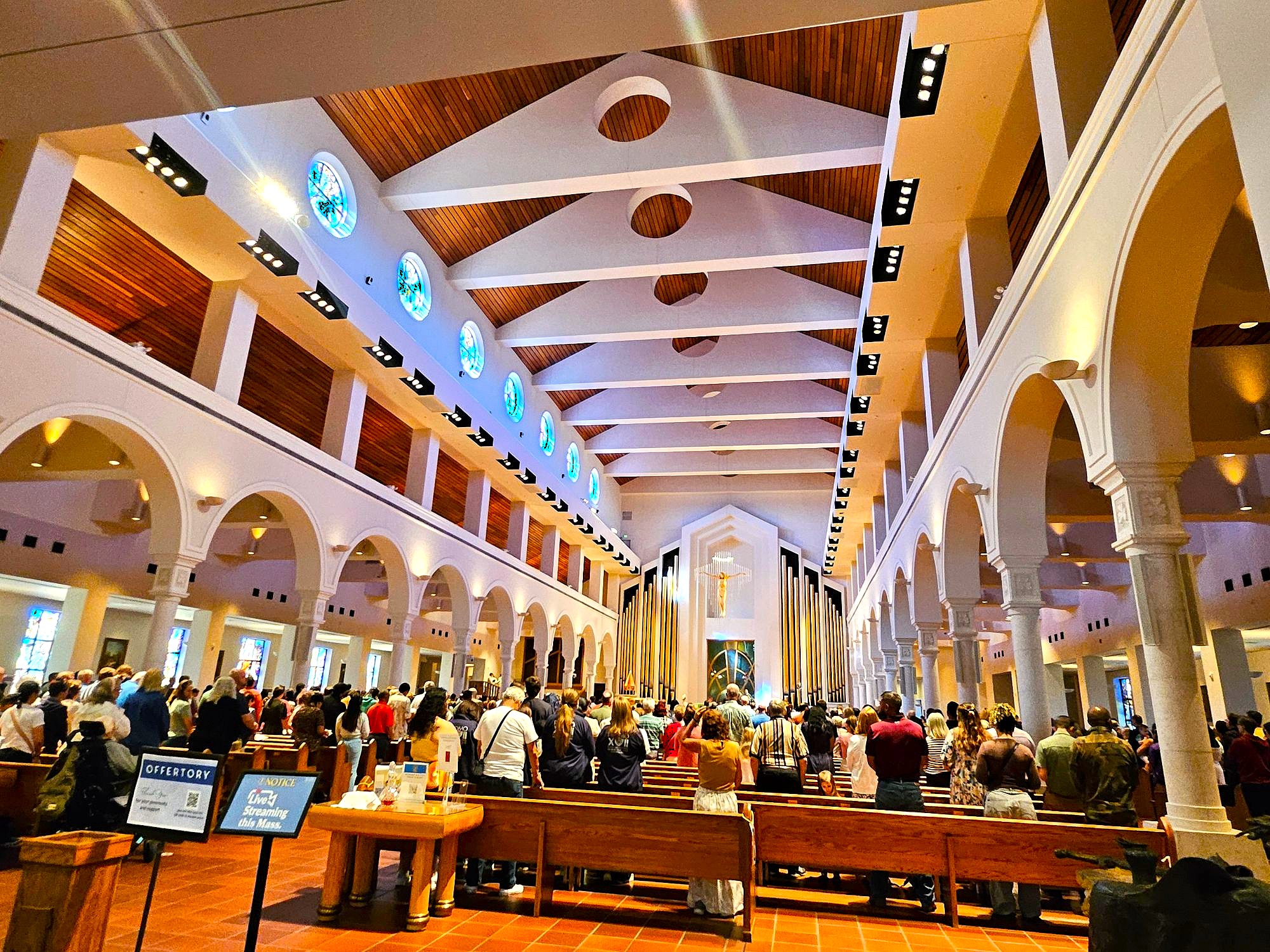 Inside the Sanctuary, with permanent seating for 2,500 and more added on holidays. Shown is the 10 AM Mass on Sunday, Oct. 12, 2025, one of several Masses that day.