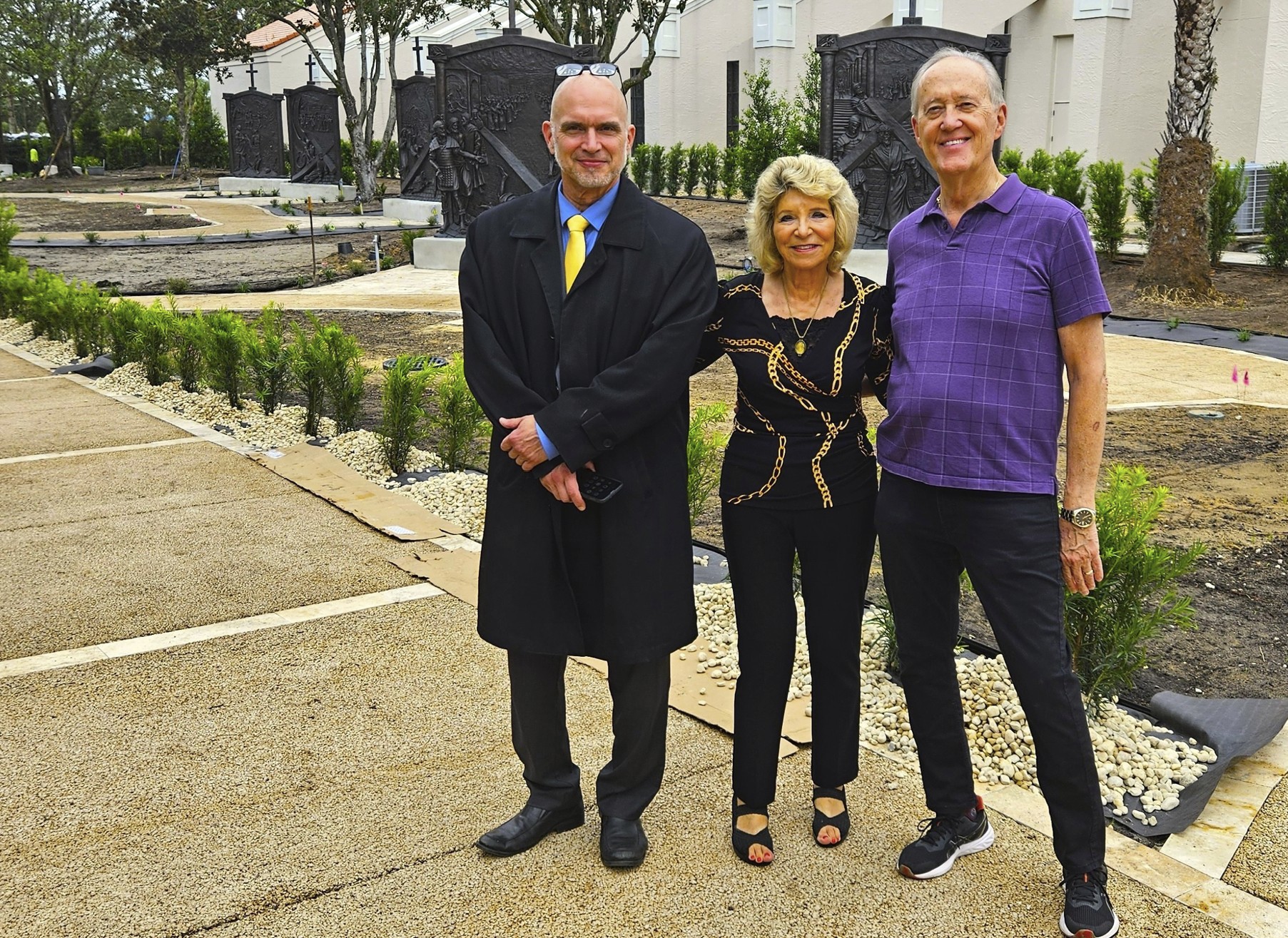 Shown from left to right are sculptor Timothy Schmalz, Myra Kahn Adams, and David Adams. On the grounds adjacent to the Basilica's Sanctuary are the Gospel Gardens - Stations of the Cross. The Gardens will be completed in November. Fourteen gigantic Stations of the Cross were created by Timothy Schmalz, "Sculptor to the Popes."